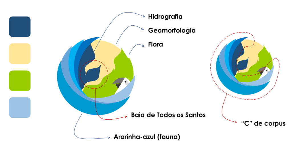 O isotipo (cf. figura ao lado) criado para o portal retoma os elementos constituintes básicos a partir dos quais se desdobram as principais interações toponímicas com o mundo natural: a hidrografia (na cor azul), a geomorfologia (na cor creme), a flora (na cor verde) e a fauna (na imagem da ararinha-azul). Esses elementos, geralmente vistos pela ótica antropocêntrica como recursos a serem apropriados, não só se projetam de forma substancial na toponímia, mas fornecem as bases que sustentam o mundo cultural onde as interações de natureza antrópica se estabelecem. Ainda no interior da esfera, destaca-se o desenho de uma baía simbolizando a Baía de Todos os Santos, entidade motivadora do nome do estado. A ararinha-azul envolve a esfera formando um ‘C’ de corpus que se estende desde a cabeça até a extremidade da asa.